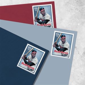 From humble beginnings, Hank Aaron (1934–2021) went on to rewrite the record books while prevailing in the face of racism. The stamp art features a digital portrait of Aaron as a member of the Atlanta Braves™.